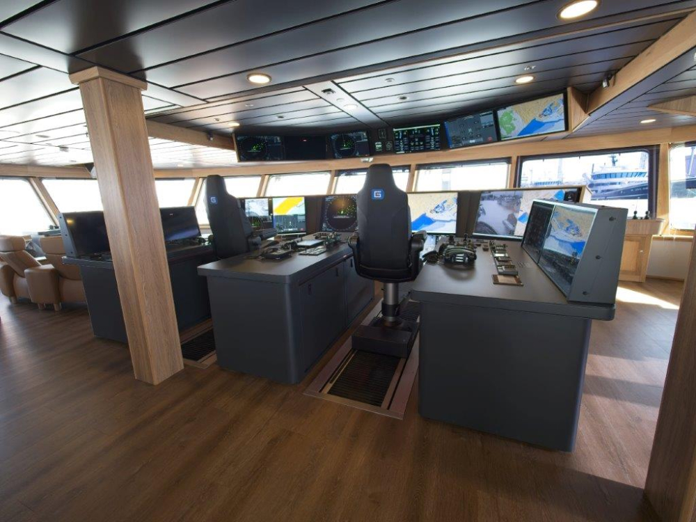 The wheelhouse is equipped with advanced navigation and control systems, including consoles provided by El-Pro of Norway, and features Nor-Sap 1600 chairs for comfort during extended periods of operation. Additionally, the layout and technology in the wheelhouse are tailored to ensure seamless integration with the vessel’s extensive electronic systems, such as radar, sonar, autopilot, and other key navigational aids supplied by leading manufacturers like Simrad and JRC.