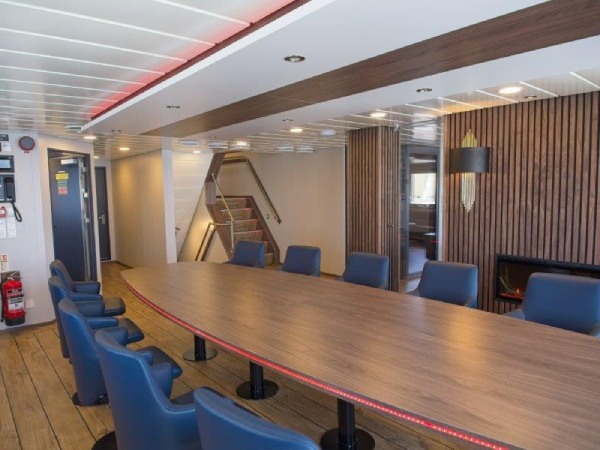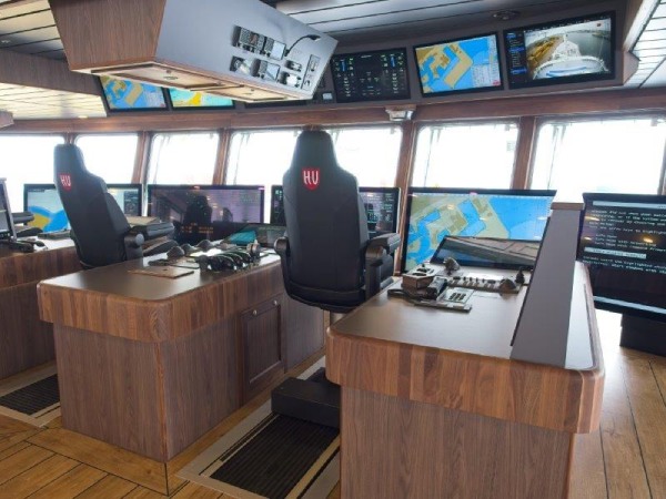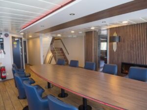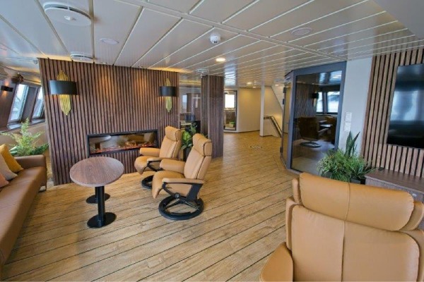 Interior design and furniture were supplied by Maritime Montering and Ekornes, with noise insulation engineered through placement and construction materials.