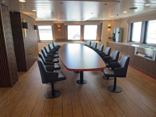 With noise levels in most crew cabins kept below 50 dB(A), Havfisk offers a modern and comfortable environment. The accommodation spans across multiple decks, including private quarters, a mess hall, recreation room, hospital, and laundry facilities. The vessel has 13 crew cabins, including 4 for officers.